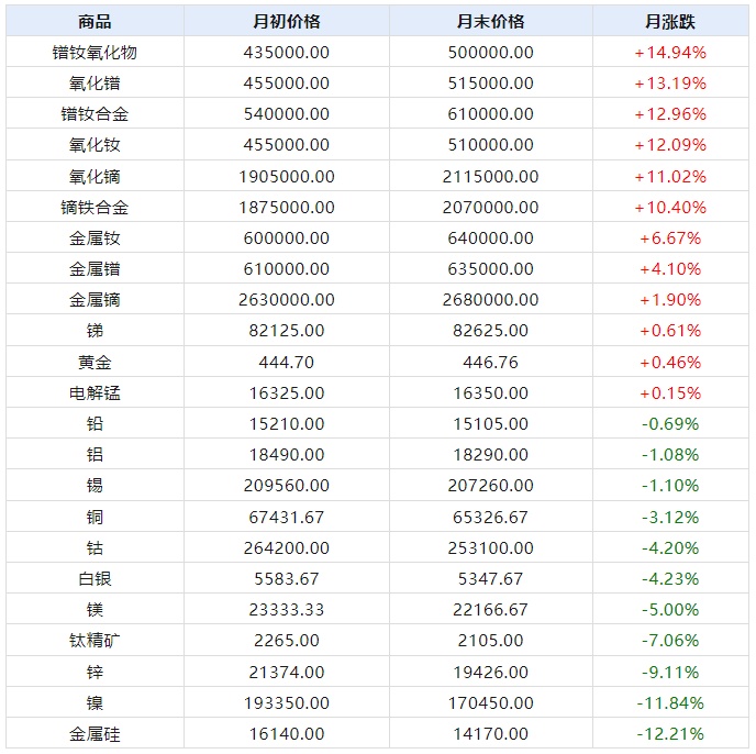 镨钕氧化物(+14.94%):5月份轻稀土市场行情走势上涨,轻稀土自2月价格持续走低,进入5月份止跌回升,近期询单增加,因为前期轻稀土价格下行已久,所以受询盘增加影响,持货商报价较为坚挺,实际成交价格随之上涨。近期市场询价和报价相对活跃,成交量略有增多,当前镨钕氧化物现货持续偏紧,6月将至,长协交单也即将再次开始,持货商报价再次上调,轻稀土价格节节攀升。