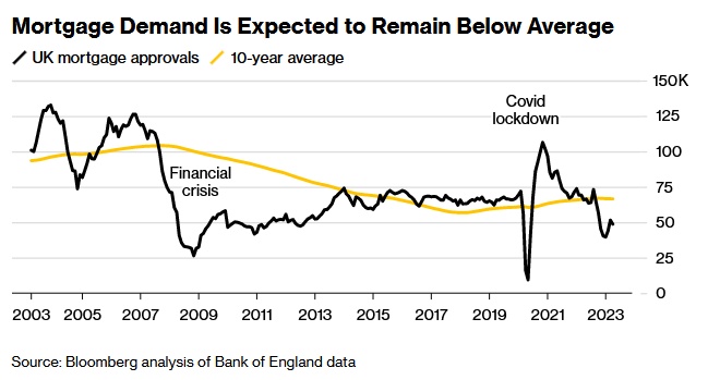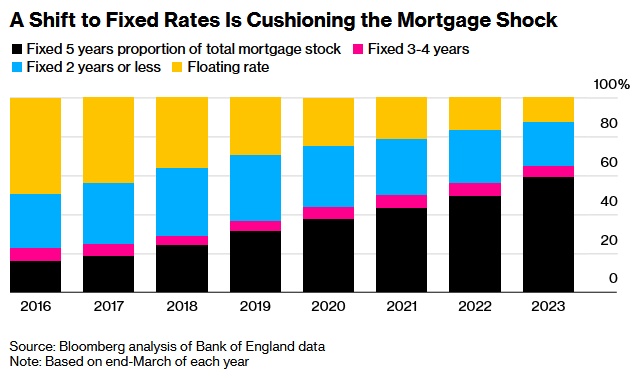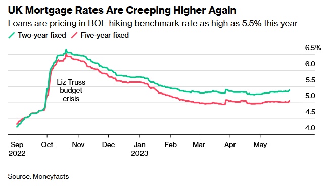 交易员预计,英国央行今年将把利率最高上调至5.5%。抵押贷款利率在去年秋季英国国债市场动荡期间飙升至14年高点后有所回落,近期又开始上升。目前,最多人使用的抵押贷款的利率已高于英国央行确定的消费者压力阈值5%。