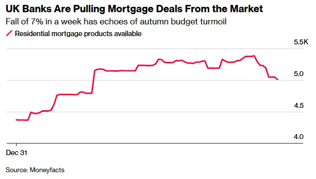 与此同时,由于预计借贷成本将进一步上升,英国银行已开始从市场上撤下利率较低的抵押贷款产品。英国金融信息机构Moneyfacts Group Plc的数据显示,英国银行的住房抵押贷款产品的数量在上周六下降了3%以上,至5012种。这一降幅为今年以来的最大降幅,产品数量则降至今年3月以来的最低水平。