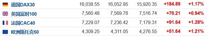 2.截至发稿,德国DAX指数涨1.17%,英国富时100指数涨0.94%,法国CAC40指数涨1.28%,欧洲斯托克50指数涨1.21%。