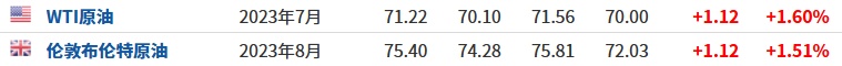 3.截至发稿,WTI原油涨1.60%,报71.22美元/桶。布伦特原油涨1.51%,报75.40美元/桶。