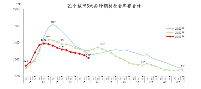 智通财经APP获悉,据中国钢铁工业协会最新数据显示,5月下旬,21个城市5大品种钢材社会库存1031万吨,环比减少63万吨,下降5.8%,库存降幅扩大;比4月下旬减少120万吨,下降10.4%;比年初增加279万吨,上升37.1%;比上年同期减少176万吨,下降14.6%。