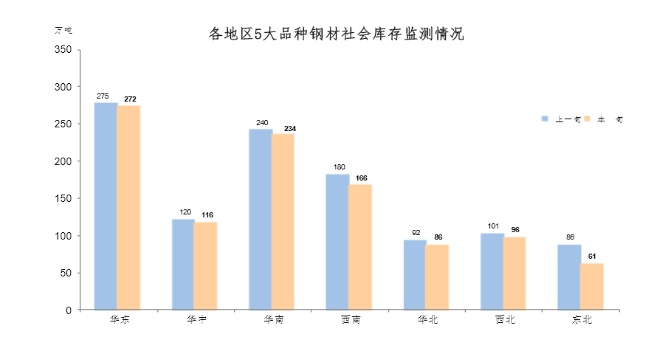 5月下旬,分地区来看,七大区域钢材社会库存环比均有不同程度下降,具体情况为:东北地区库存环比减少25万吨,下降29.1%,为减量、降幅最大地区;西南减少14万吨,下降7.8%;华北、华南环比减量均为6万吨,分别下降6.5%和2.5%;西北减少5万吨,下降5.0%;华中减少4万吨,下降3.3%;华东减少3万吨,下降1.1%。