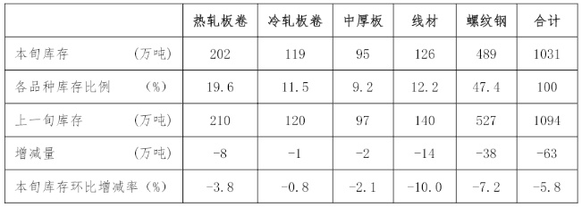 5月下旬,21个城市5大品种钢材社会库存1031万吨,环比减少63万吨,下降5.8%,库存降幅扩大;比4月下旬减少120万吨,下降10.4%;比年初增加279万吨,上升37.1%;比上年同期减少176万吨,下降14.6%。