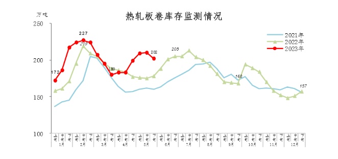 5月下旬,热轧板卷库存202万吨,环比减少8万吨,下降3.8%,库存由升转降;比4月下旬增加3万吨,上升1.5%;比年初增加45万吨,上升28.7%;比上年同期增加24万吨,上升13.5%。