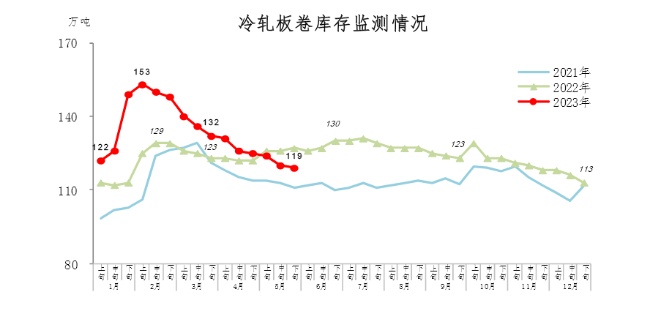 5月下旬,冷轧板卷库存119万吨,环比减少1万吨,下降0.8%,库存小幅下降;比4月下旬减少6万吨,下降4.8%;比年初增加6万吨,上升5.3%;比上年同期减少8万吨,下降6.3%。