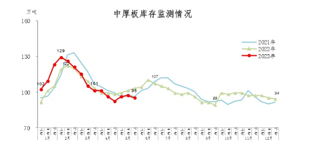 5月下旬,中厚板库存95万吨,环比减少2万吨,下降2.1%,库存由升转降;比4月增加3万吨,上升3.3%;比年初增加1万吨,上升1.1%;比上年同期减少8万吨,下降7.8%。