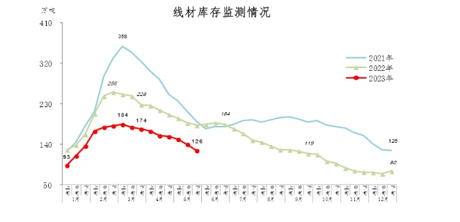 5月下旬,线材库存126万吨,环比减少14万吨,下降10.0%,库存降幅扩大;比4月下旬减少31万吨,下降19.7%;比年初增加46万吨,上升57.5%;比上年同期减少56万吨,下降30.8%。