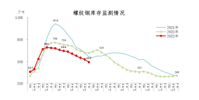 5月下旬,螺纹钢库存489万吨,环比减少38万吨,下降7.2%,库存持续下降;比4月下旬减少89万吨,下降15.4%;比年初增加181万吨,上升58.8%;比上年同期减少128万吨,下降20.7%。