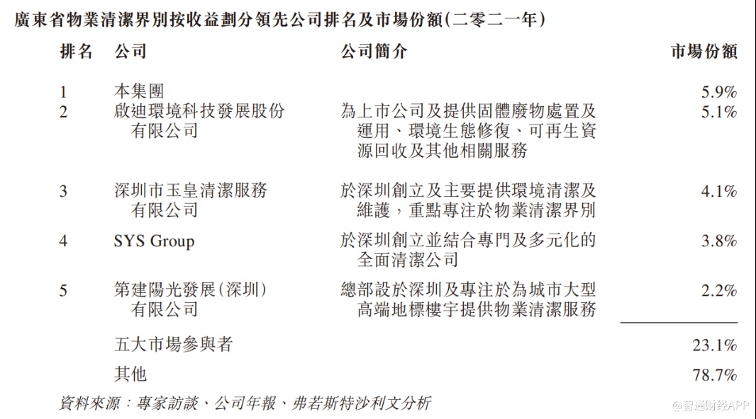 弗若斯特沙利文报告显示,广东省物业清洁界别经历稳定发展期,加上市场竞争激烈。与全国环境清洁及维护服务市场相比,广东省属于行业发展的关键地区,其快速增长主要源于物业清洁界别。市场上专门从事物业清洁的主要业者众多,但其旨在以独立第三方服务供应商提供全国性服务。