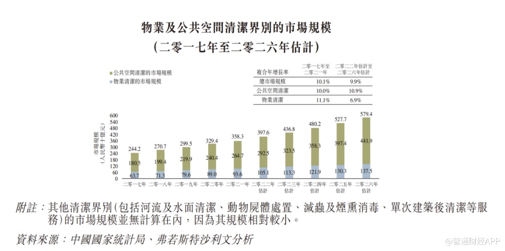 根据弗若斯特沙利文报告,中国环境清洁及维护市场主要由物业清洁及公共空间清洁界别组成及主导。该两个界别的市场规模预计将由2017年的2,442亿元增加至2026年的5,794亿元。物业清洁的市场规模预计将由2017年的637亿元大幅增加至2026年的1,375亿元。