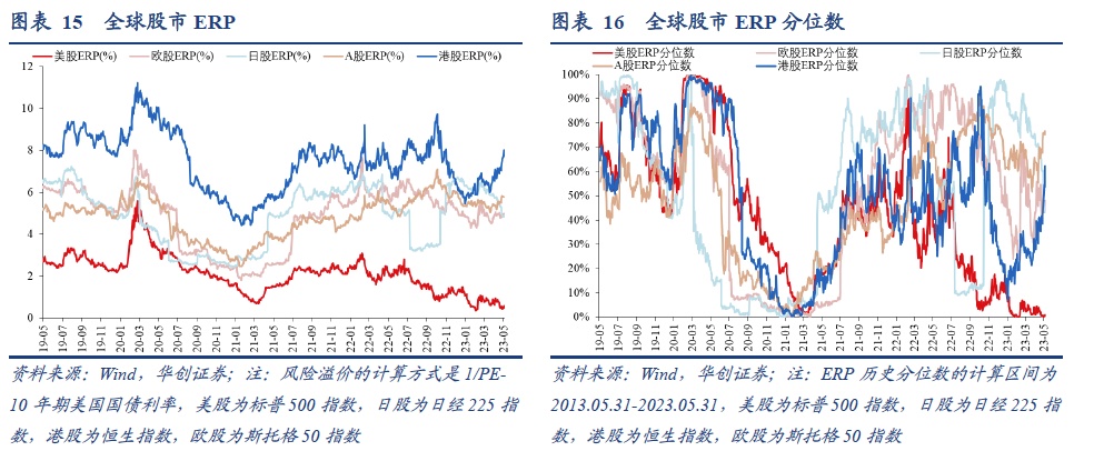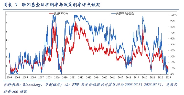 ERP是投资者主动承担风险购买风险资产能够获得的风险补偿溢价,可以用来衡量股债性价比。截至2023年5月底,美股ERP短暂反弹后再次跌至历史极端低位,历史分位数一度降至0.8%。