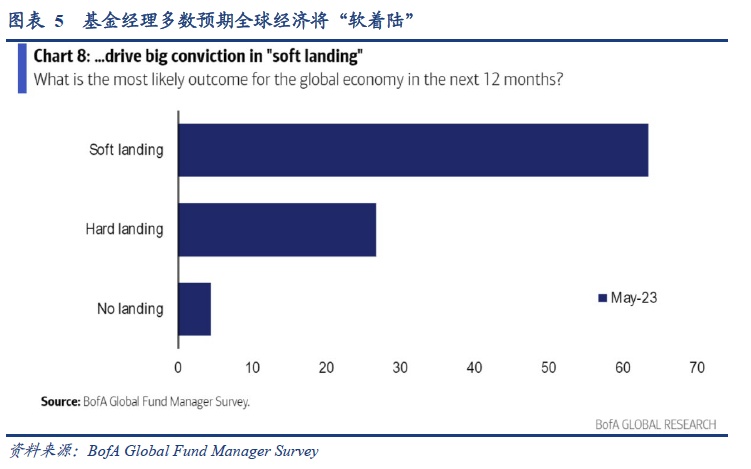 市场普遍预期全球经济将“软着陆”。根据2023年5月的美国银行全球基金经理调查,基金经理认为全球经济软着陆的概率要大于硬着陆。