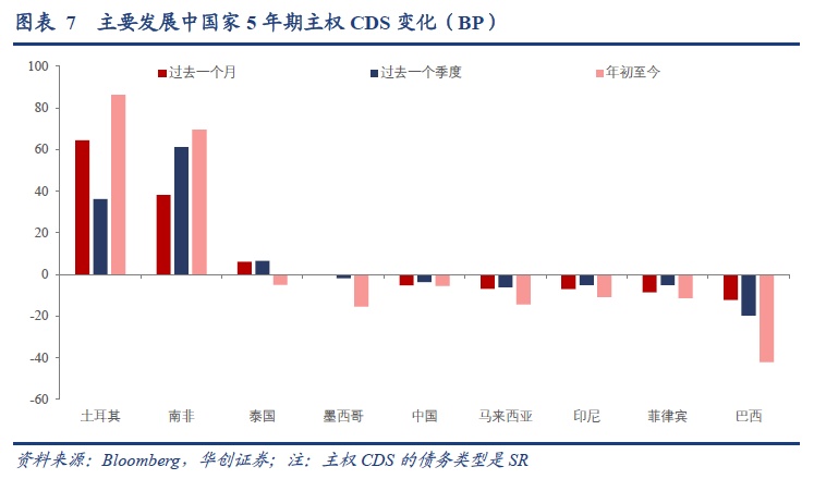 新兴市场中土耳其和南非的主权债务CDS明显上升,年初至今分别上升86.36BP和69.66BP。而亚洲新兴市场中仅有泰国的主权债务CDS近期略有上升,过去一个月上升了6.18BP。
