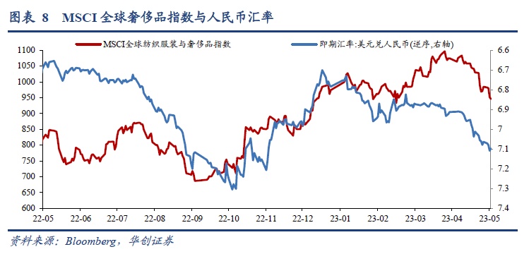 中国市场是奢侈品消费的重要市场,中国经济的预期以及中国消费者的消费能力对于奢侈品价格会有重要影响。与此同时,人民币汇率同样反映了市场对中国经济的预期。因此,在过去的一年中我们可以看到MSCI全球纺织服装与奢侈品指数的走势与美元兑人民币汇率基本一致。