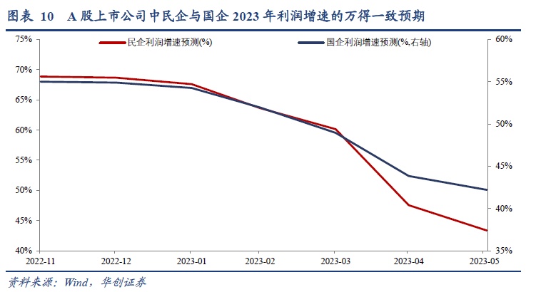 万得一致利润预期反映的是市场上的证券分析师对所覆盖的公司2023年利润总额的预测。我们统计了全部A股中有研究员发布利润总额预测的上市公司,并将其分为民营企业和国有企业,统计其利润增速预测的时间序列。可以发现,年初至今,证券分析师对民企上市公司、国企上市公司的利润增速预测持续回落,截至5月底分别为43.35%和42.20%,其中民企上市公司利润增速预测回落的幅度更大。