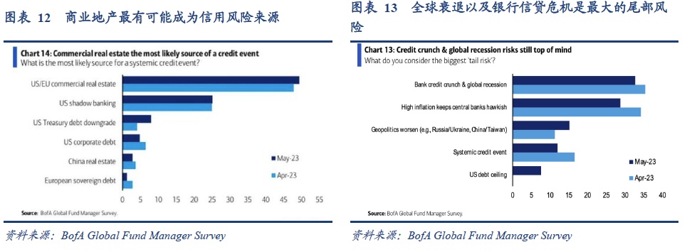 根据美银全球基金经理调查报告,全球经济衰退以及银行信贷危机是最大的尾部风险。在2023年4月,35%的基金经理认为银行信贷危机和全球经济衰退是最大的尾部风险,其次是通胀居高不下令央行维持鹰派(34%),系统性信用事件是第3位(16%)。到了2023年5月,33%的基金经理认为银行信贷危机和全球经济衰退是最大的尾部风险,其次是通胀居高不下(29%),第3位是地缘政治风险(15%)。
