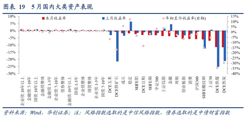5月全球大类资产总体表现为:美元(2.62%)>0%>全球股票(-1.09%)>全球债券(-1.95%)>人民币(-2.67%)>大宗商品(-6.50%)。