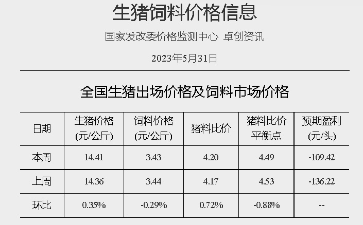 智通财经APP获悉,6月5日,国家发改委发布2023年5月第5周猪料比价。其中提到,5月第5周全国猪料比价为4.20,环比微涨0.72%。按目前价格及成本推算,未来生猪养殖头均亏损为109.42元。部分养殖单位月度出栏计划完成缓慢,养殖端销售压力仍存,同时国内多地高温天气导致鲜销产品走货滞缓,屠宰企业开工率略降,供需两端双重利空之下,猪价偏弱运行,但周均价水平仍略高于上一周。短期内养殖单位出栏节奏或较为稳定,市场暂未出现明显利多提振,预计下周猪价或延续偏弱震荡走势。