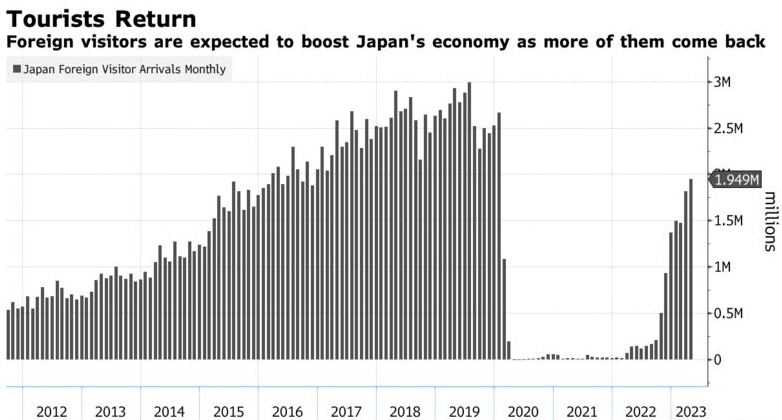 智通财经APP获悉,外国游客的消费正在帮助日本经济走出衰退,这也给酒店业的薪酬和物价带来了上行压力。日本国家旅游局的数据显示,今年4月,近200万海外游客到访日本,而去年同期的海外游客还不到14万。尽管这与疫情前每月近300万人次的水平还有一段距离,但数据显示,在今年头三个月1.6%的年化经济增长率中,外国游客消费的回归已经贡献了1.1个百分点。