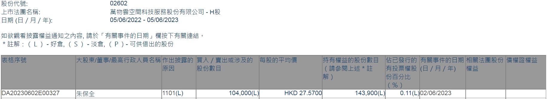 智通财经APP获悉,香港联交所最新资料显示,6月2日,董事长朱保全增持万物云(02602)10.4万股,每股作价27.57港元,总金额约为286.73万港元。增持后最新持股数目为14.39万股,最新持股比例为0.11%。