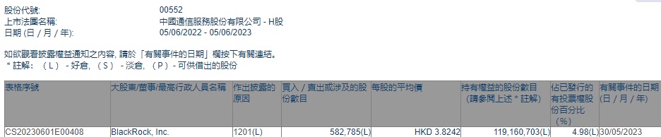 智通财经APP获悉,香港联交所最新资料显示,5月30日,贝莱德减持中国通信服务(00552)58.2785万股,每股作价3.8242港元,总金额约为222.87万港元。减持后最新持股数目约为1.19亿股,最新持股比例为4.98%。
