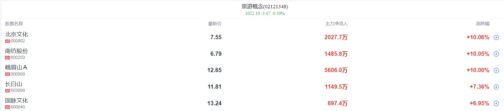 旅游酒店股继续活跃,峨眉山A4天3板,长白山、九华旅游涨超6%。