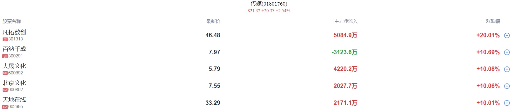 传媒、游戏、虚拟数字人等AI应用方向再度活跃,凡拓数创20CM涨停,天地在线7天5板,大晟文化、北京文化、中国出版等多股涨停,恒信东方、百纳千成涨超10%。