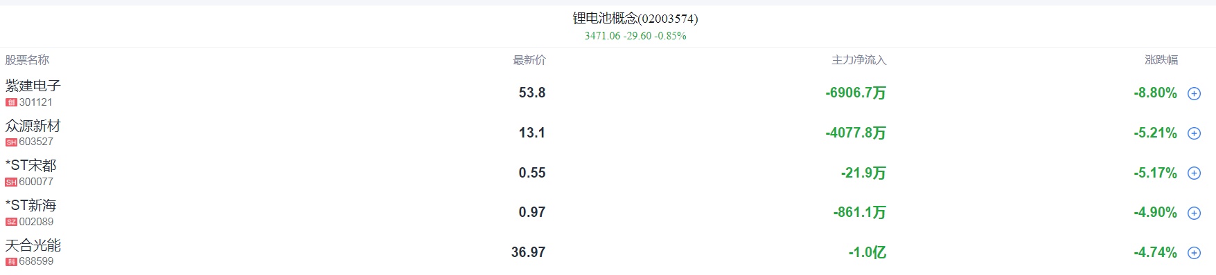 锂电、光伏、风电、汽车产业链等新能源方向集体下挫,尚纬股份跌停,紫建电子、航天机电等跌超5%,宁德时代一度跌超5%。