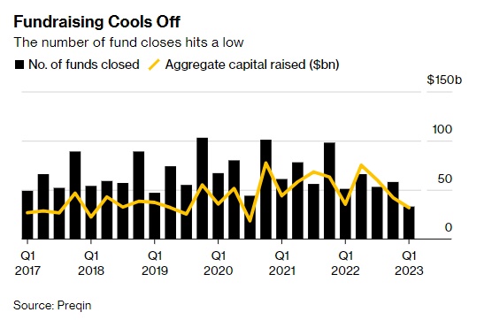 根据Preqin的一份报告,2023年前三个月,33只基金的融资额为319亿美元,较去年同期下降了约10%。但数据显示,今年第一季度的基金关闭数量是至少自2017年以来的最低水平。