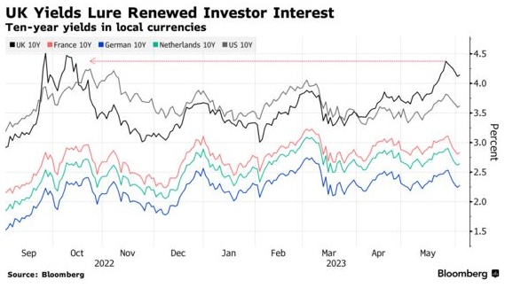 英国10年期国债收益率为4.2%,是发达经济体中第二高的。根据计算,以欧元计算,这一涨幅为2.8%,以美元计算为3.9%,高于基准德国和美国证券的2.4%和3.7%。