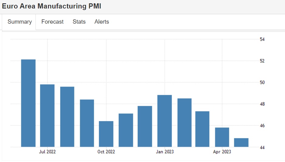 最新数据标志着自欧元区2023年初经济活动开始再次上升以来的首次增长放缓,产出增幅为三个月来最低。服务业活动继续增长,尽管速度放缓,而由于订单迅速恶化,制造业生产水平以11月以来的最快速度下降。新业务总量在5月份几乎停滞不前,新出口销售额连续15 个月下降,而创造就业不例虽然低于4月份,但稳健且快于整个系列平均水平。最后,欧元区成本压力进一步降温,