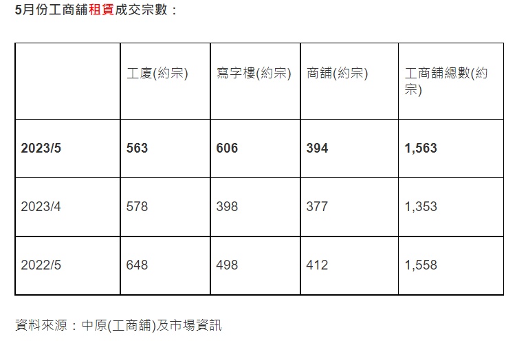 潘志明又表示,按类别分析的话,5月份以写字楼物业租务最为突出,共录得约606宗成交,对比4月急增约52%,按年对比亦多出约21%,而涉及的成交金额达5802万港元,较4月份多出1.14倍。事实上,过去三年间,写字楼市场为工商铺范畴中最为受压,因为自香港封关下,国内及外资企业及要员未能来港,经济环境同步欠佳,亦令企业对承租写字楼态度趋保守,单月写字楼租务成交大多少于400宗水平。翻查资料,对上一次录得超过600宗写字楼租赁个案已经要追溯至2021年8月,当时同录得约606宗,意味最新写字楼租务成交量为近两年疫情以来单月新高。