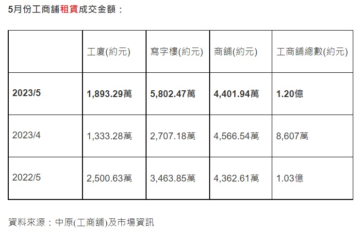 中原(工商铺)董事总经理潘志明表示,根据中原(工商铺)资料,5月份工商铺市场租赁总成交金额录得约1.2亿港元,环比大幅增多约四成,对比2022年5月亦多出逾1700万港元,占比约16.5%,反映个别工商铺租务成交涉及较大银码的单一成交所致。