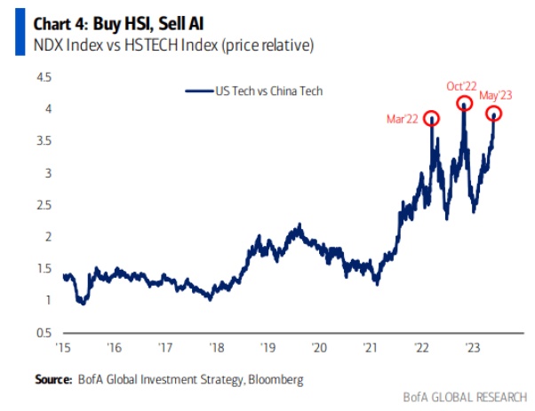 由于人工智能领域的“婴儿泡沫 ”(baby bubble)最近成为主题,Hartnett表示,“6月份的逆势交易(Contrarian Trading)是‘买入恒指,卖出人工智能’。”