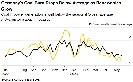 整个地区需求的降低可以提高可再生能源在满足电力需求方面的作用,并减少对煤炭等更昂贵燃料的依赖。德国的柴油燃烧量已经达到了每年这个时候季节性平均水平的一半左右。今年5月,欧洲太阳能电池板的发电量首次超过了煤炭。