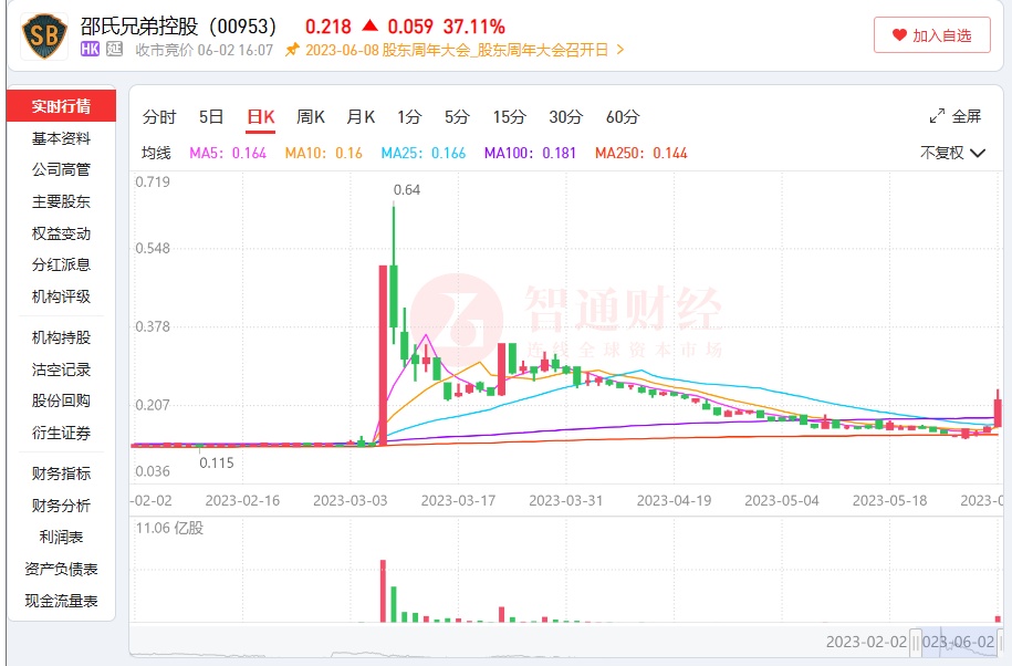 6月2日,邵氏兄弟控股再次“扬眉”,早盘一度涨超50%。截至收盘,公司收报0.219港元,涨幅超37.7%。