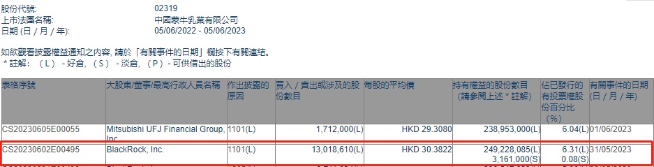 智通财经APP获悉,香港联交所最新资料显示,5月31日,贝莱德增持蒙牛乳业(02319)1301.8610万股,每股作价30.3822港元,总金额约为3.96亿港元。增持后最新持股数目约为2.49亿股,最新持股比例为6.31%。