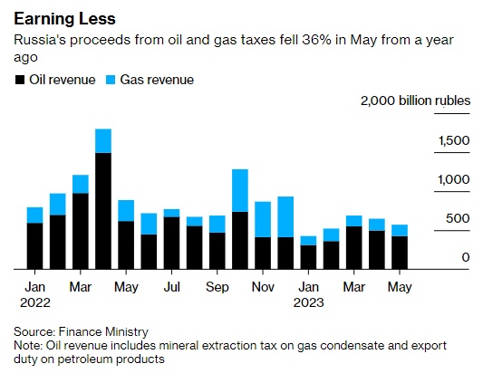 智通财经APP获悉,受西方国家制裁导致原油价格下跌和对欧洲天然气出口减少的影响,俄罗斯5月份的石油和天然气收入下降了逾三分之一。俄罗斯财政部周一表示,来自石油和天然气税的预算收入同比下降36%,至5707亿卢布(合70亿美元)。根据计算,原油和石油产品的税收(占5月份总碳氢化合物收入的75%)下降了31%,至4258亿卢布。