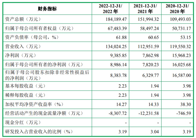 财务方面,于2020年度、2021年度、2022年,飞沃科技实现营业收入分别约为11.96亿元、11.30亿元、13.40亿元人民币;净利润分别为约1.60亿元、7862.98万元、9385.85万元人民币。