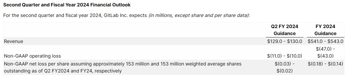 展望未来,GitLab预计,2024财年第二季度营收在1.29亿美元至1.30亿美元之间,好于分析师预期的1.271亿美元;预计Non-GAAP每股亏损在0.02美元至0.03美元之间,好于分析师预期的每股亏损0.08美元。