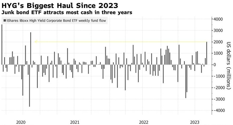 智通财经APP获悉,在风险资产普遍反弹之际,投资者正以近三年来最快的速度向规模最大的垃圾债券交易所交易基金(ETF)投入资金。根据彭博汇编的数据,上周超过20亿美元涌入了规模170亿美元的iShares iBoxx高收益公司债券ETF(HYG.US)。这是在固定收益ETF中规模最大的,也是该ETF自2020年11月以来最大的单周流入。