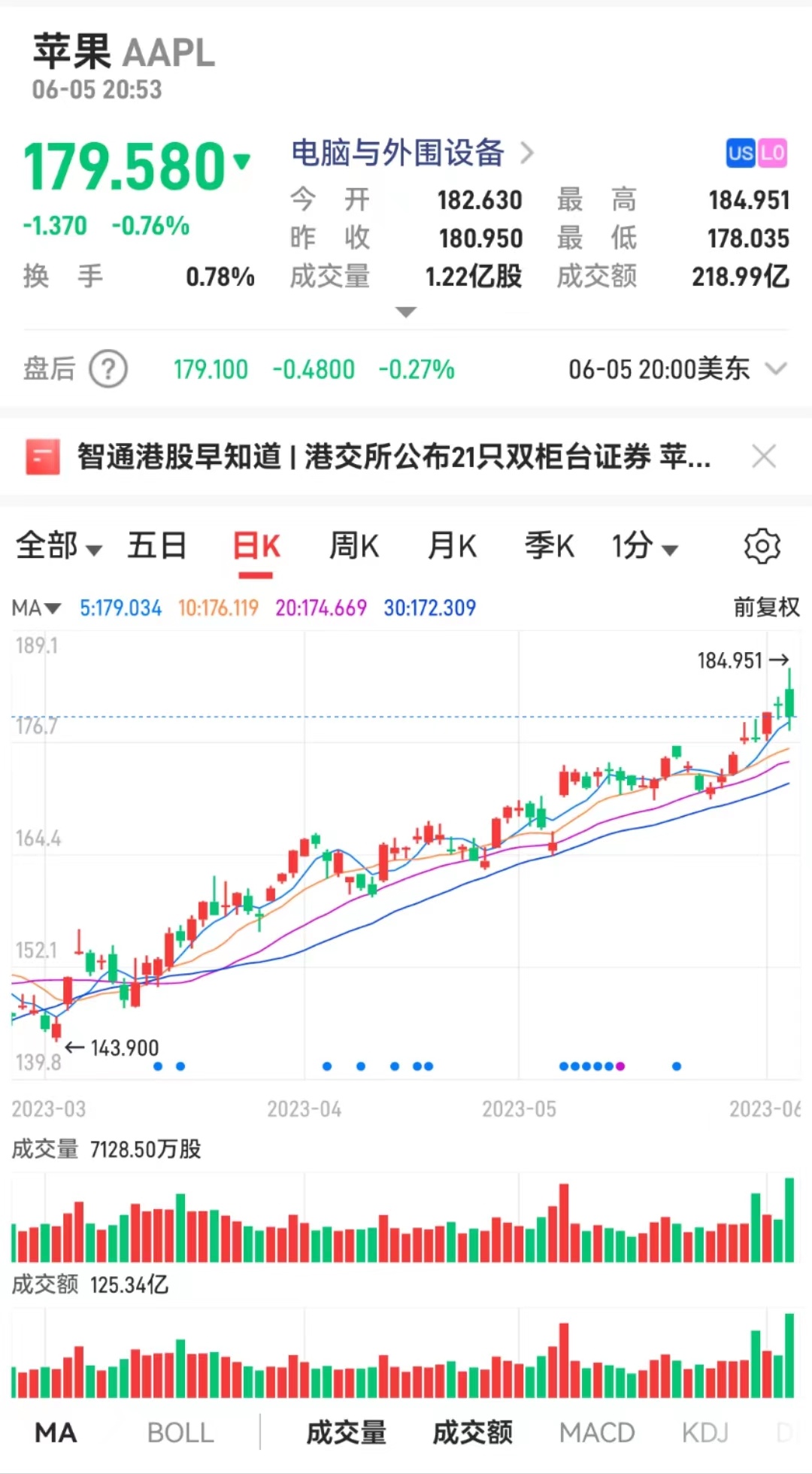 不过,这个备受期待的发布会似乎并没有打动投资者。在WWDC之前,苹果公司股价刷新历史新高,美股开盘一度涨超2%,然而,当Vision Pro的价格公布后,该股迅速跳水,尾盘一度跌超1%,3499美元的售价显然超出了市场预期,苹果股价周一收跌0.76%。