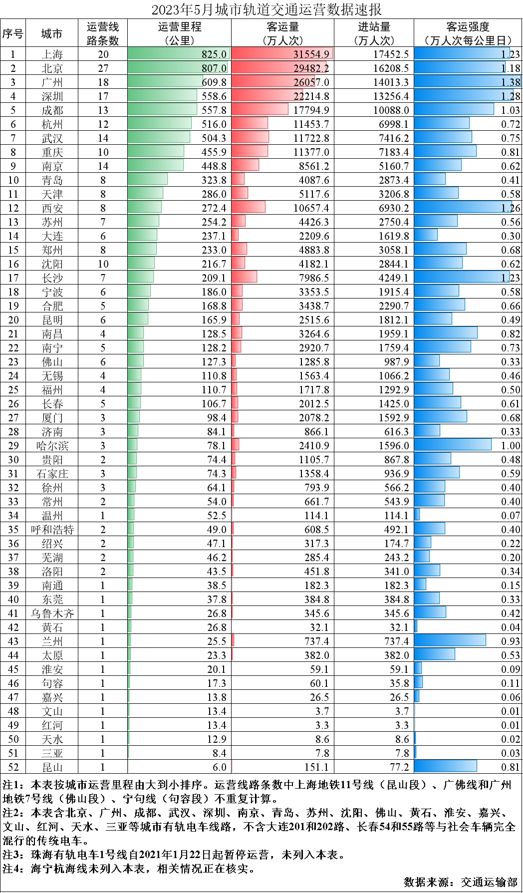 智通财经APP获悉,6月6日,交通运输部发布5月城市轨道交通运营数据速报。数据显示,2023年5月,31个省(自治区、直辖市)和新疆生产建设兵团共有54个城市开通运营城市轨道交通线路292条,运营里程9652.6公里,实际开行列车322万列次,完成客运量24.9亿人次,进站量15亿人次。5月份,客运量环比减少0.4亿人次、降低1.5%,同比增加11.6亿人次、增长87%,较2019年月均客运量增加5亿人次、增长25.3%。5月份客运强度平均水平为0.528万人次每公里日,较2019年全年客运强度平均水平降低3.2%。本月无新增运营线路和区段。