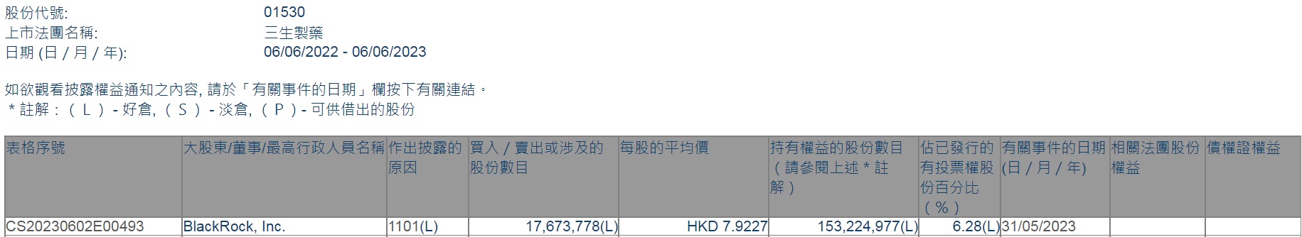 智通财经APP获悉,香港联交所最新资料显示,5月31日,贝莱德增持三生制药(01530)1767.3778万股,每股作价7.9227港元,总金额约为1.4亿港元。增持后最新持股数目约为1.53亿股,最新持股比例为6.28%。