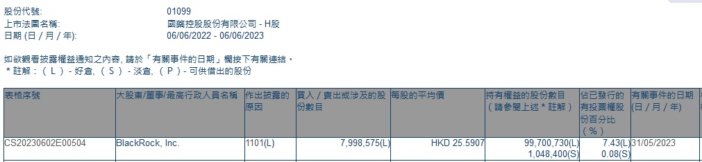 智通财经APP获悉,香港联交所最新资料显示,5月31日,贝莱德增持国药控股(01099)799.8575万股,每股作价25.5907港元,总金额约为2.05亿港元。增持后最新持股数目约为9970.07万股,最新持股比例为7.43%。