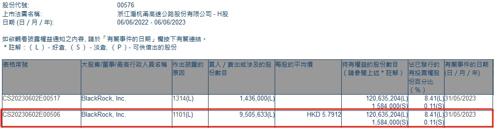 智通财经APP获悉,香港联交所最新资料显示,5月31日,贝莱德增持浙江沪杭甬(00576)950.5633万股,每股作价5.7912港元,总金额约为5504.90万港元。增持后其持股数目约为1.21亿股,最新持股比例为8.41%。