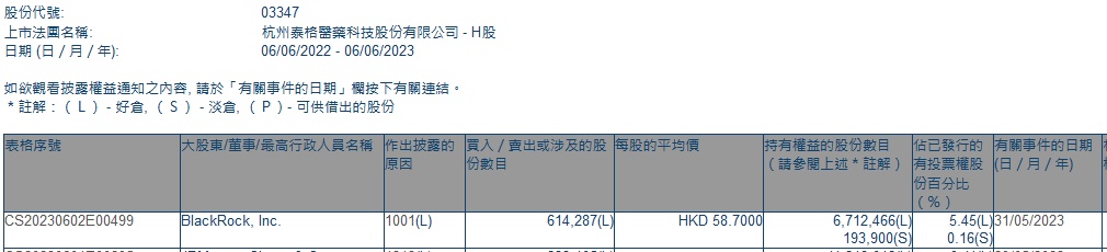 智通财经APP获悉,香港联交所最新资料显示,5月31日,贝莱德增持泰格医药(03347)61.4287万股,每股作价58.70港元,总金额约为3605.86万港元。增持后最新持股数目约为671.25万股,最新持股比例为5.45%。