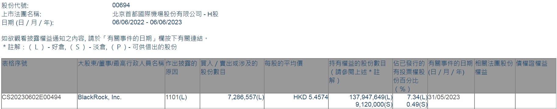 智通财经APP获悉,香港联交所最新资料显示,5月31日,贝莱德增持北京首都机场股份(00694)728.6557万股,每股作价5.4574港元,总金额约为3976.57万港元。增持后最新持股数目为1.38亿股,最新持股比例为7.34%。
