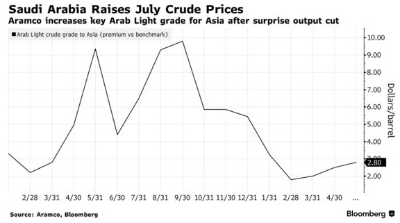沙特阿拉伯提高了7月份所有地区的官方销售价格,此前欧佩克+产油国承诺在同月进一步削减供应,以稳定石油市场。由于需求疲软,亚洲炼油商正在努力应对炼油利润率低迷的问题,一些炼油商正在考虑限制业务。